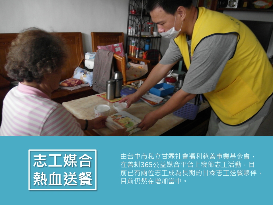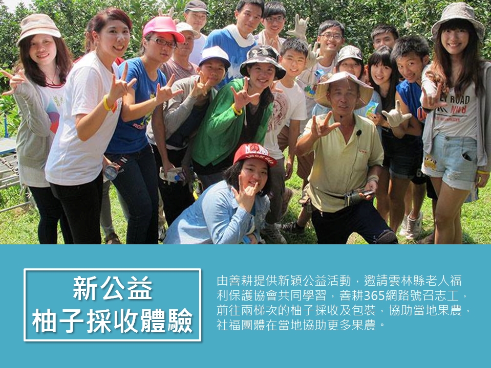 「善耕365公益媒合平台」也實現O2O的概念,將虛擬網路平台雲端概念又結合了實體活動,讓社福團體可以在網站上發起活動,學生志工可以在平台進行「媒合」成為志工,前往社福團體協助。