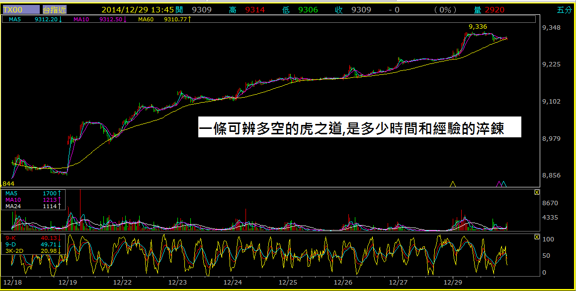 十五年台指期操作歷鍊,求學時期就熱愛研究台股,從股票投資入門,並在2000年和台指期結下不解之緣,歷經三次台股地獄式大殺盤,深覺台指的操作有許多不為人知的操盤定律,在不斷拜師學習及個人實戰鑽研後,終創真正能獲利台指期當沖操盤法,以反市場心理為依歸,曾用一口單當沖,一個月最高獲利22萬。