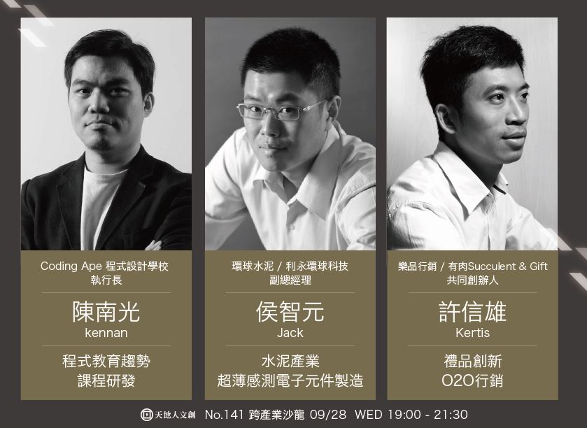跨產業沙龍,一個專業人士的人脈交流與產業學習平台。於每週三19:00-21:30固定籌辦。每場次皆邀請三位不同領域講師分享產業工作與內容,打造北台灣不同產業人士的交流空間。產業涵蓋領域包含:外商、大型企業、成功創業家、藝術工作者等(e.g. Intel, TI, 阿里巴巴, 建築事務所, 創投, 交易室, 政府部門等,每週持續更新),每個小週末的夜晚,來到天地人文創,一次瞭解三方產業、迅速累積跨領域合作與創新動能!(了解更多> 歷屆跨產業沙龍 )