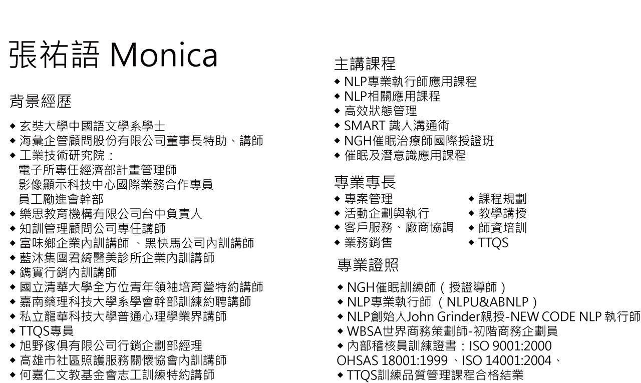 透過NLP的觀眼知心手法。快速理解溝通對象及自我的特質。強化溝通效果,同時以更適當的方式與對方互動、減少摩差。