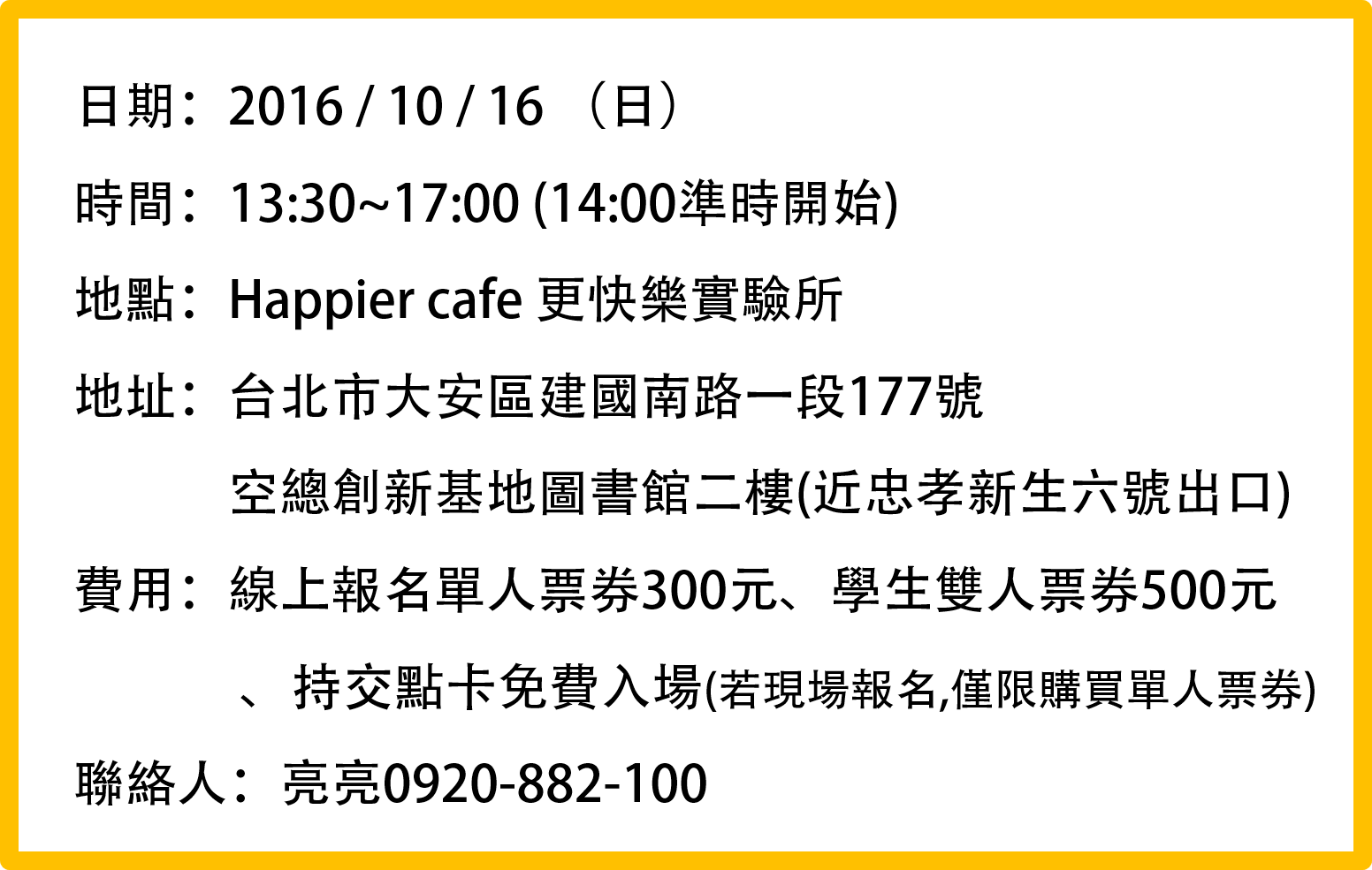 2.活動於13:30進場,14:00開始,記得先吃過午餐再來喲!