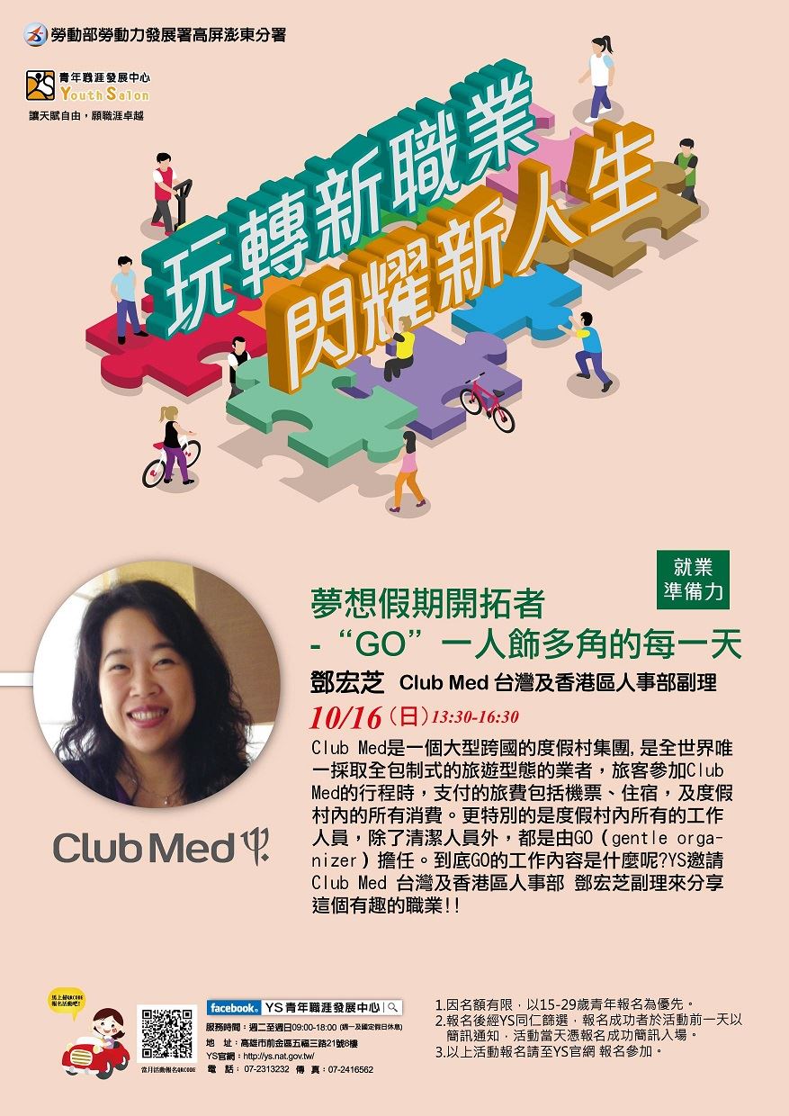 Club Med是一個大型跨國的度假村集團,是全世界唯一採取全包制式的旅遊型態的業者,旅客參加Club Med的行程時,支付的旅費包括機票、住宿,及度假村內的所有消費。更特別的是度假村內所有的工作人員,除了清潔人員外,都是由GO(gentle organizer)擔任。到底GO的工作內容是什麼呢?YS邀請Club Med 台灣及香港區人事部 鄧宏芝副理來分享這個有趣的職業~~
