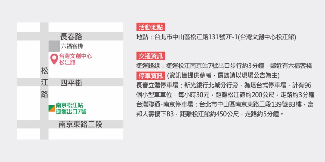 【活動地點】台灣文創訓練中心 松江館 751空間