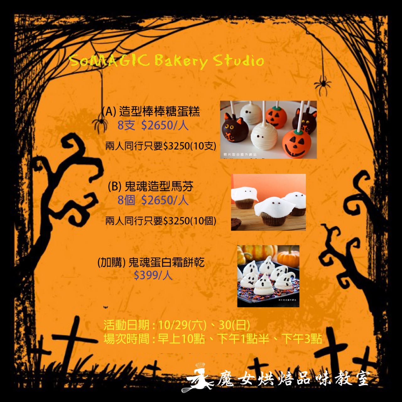 (A) 【鬼魂蛋白霜餅乾 + 遊街Treat or trick 】$999/人, 活動前&活動後皆可在魔女遊戲室玩樂。 ( PM3:00開始 )