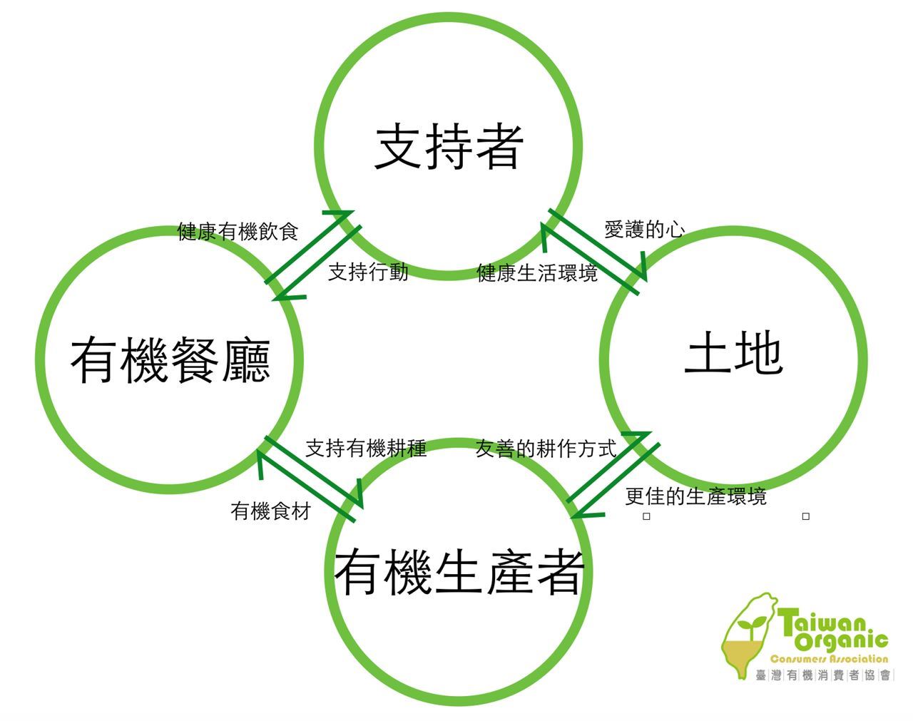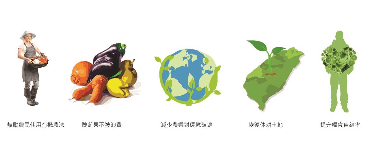 在鼓勵農民種植有機、產銷履歷之食材的同時,也讓有機小農所生產的醜蔬果不被淘汰,以提升有機農民的收入和意願。這樣的方式,能降低農業對環境的破壞、恢復台灣休耕土地,進而提升糧食自給率,使得我們有更健康的生存環境。另一方面,美食街現場料理的形式也能讓消費者可以直接看到選用在地食材或溯源或產銷履歷食材所做出之好料理。這樣的整個相互支持的過程形成了一種支持型的系統。