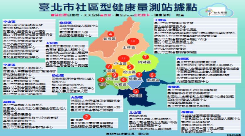 為增進民眾自我健康管理,鼓勵民眾定期健康量測,整合血壓、血氧、體溫、身高及體重等五項健康量測項目,設置「社區型健康量測站」,透過友善便捷的健康量測儀器、簡明語音操作提醒,以及透過個人身分辨識的台北卡或悠遊卡,建立專屬個人的雲端健康管理帳戶,鼓勵18歲以上市民養成規律的健康量測習慣及自我管理健康,及早發現異常健康警訊及採取健康促進行為,期共同營造高齡友善的健康服務品質。
