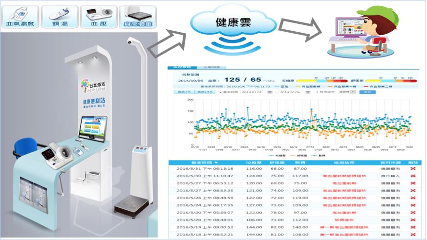 為維護市民健康、照顧弱勢族群、促進社區健康服務、建立民眾自主健康管理並關懷慢性病患者健康之責任,臺北市政府衛生局推動「市民健康保健服務方案」,提供民眾自主生理量測服務平台,民眾可透過加入衛生局「健康雲(https://cloud.health.gov.tw/)」平台,並藉由台北卡(或悠遊卡)進行多項健康量測,並上傳生理量測紀錄,系統會以曲線圖呈現數據,亦提供歷史健康紀錄下載等功能,有助於個人就診時提供醫師血壓變化資訊。若個人量測異常或久未量測,系統亦可自動發送email或簡訊通知,提醒民眾注意自已身體健康。
