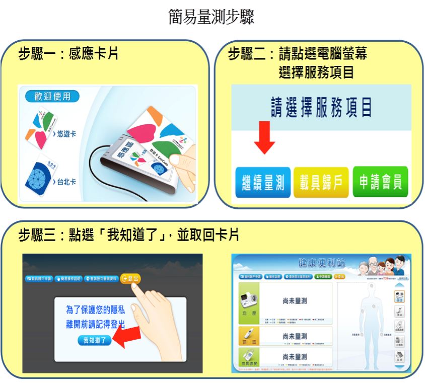 為增進民眾自我健康管理,鼓勵民眾定期健康量測,整合血壓、血氧、體溫、身高及體重等五項健康量測項目,設置「社區型健康量測站」,透過友善便捷的健康量測儀器、簡明語音操作提醒,以及透過個人身分辨識的台北卡或悠遊卡,建立專屬個人的雲端健康管理帳戶,鼓勵18歲以上市民養成規律的健康量測習慣及自我管理健康,及早發現異常健康警訊及採取健康促進行為,期共同營造高齡友善的健康服務品質。
