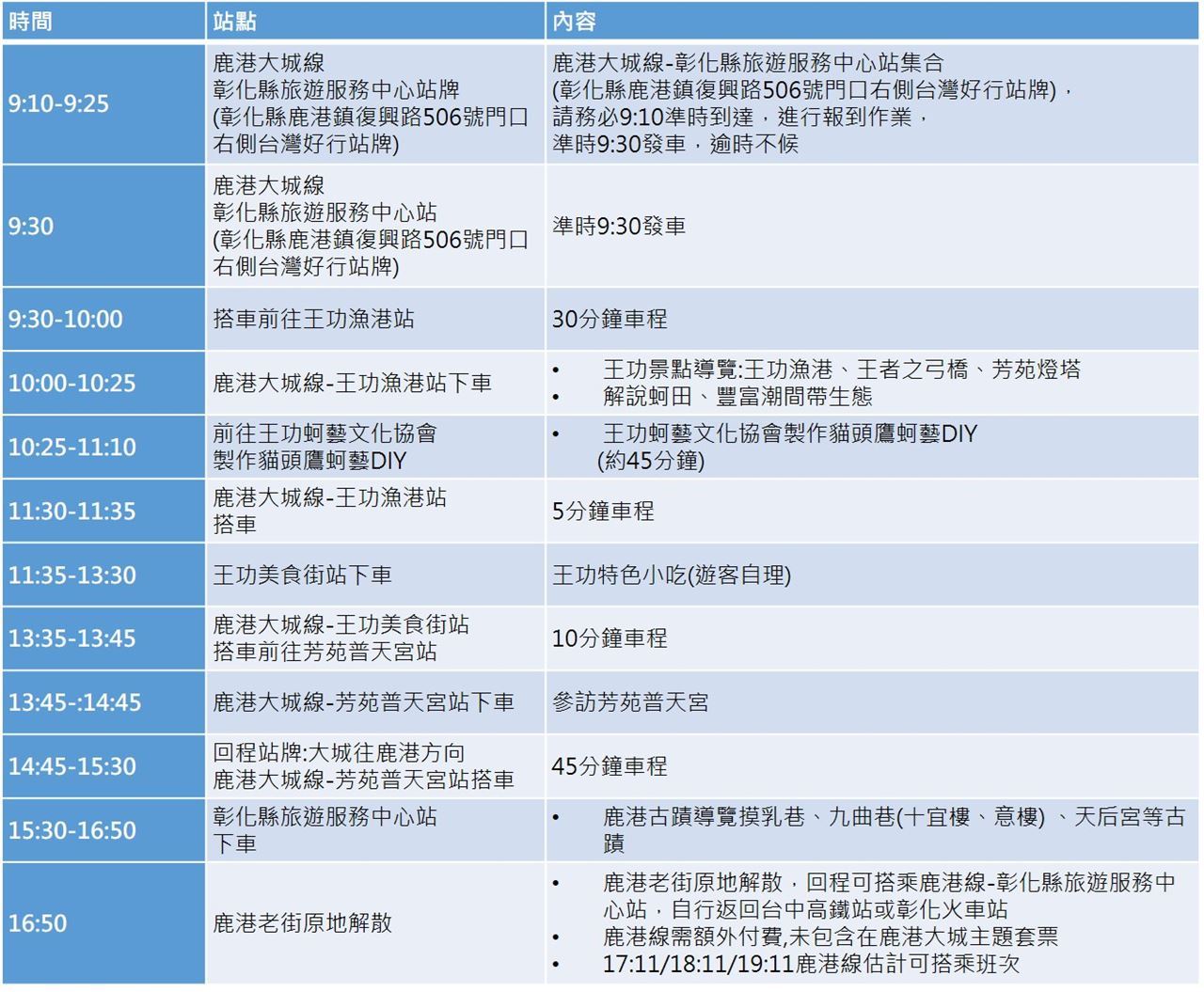 彰化縣旅遊服務中心站→王功漁港特色景觀→蚵田潮間帶生態解說→貓頭鷹蚵藝DIY→王功美食街特色小吃(遊客自理)→芳苑普天宮→鹿港古蹟導覽(鹿港老街原地解散)→可自行返回台中高鐵站或彰化火車站