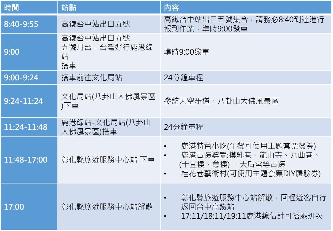 台中高鐵站→八卦山大佛風景區、天空步道→鹿港特色小吃(午餐自理)→鹿港古蹟導覽→桂花巷藝術村(彰化縣旅遊服務中心站解散)→可自行返回台中高鐵站