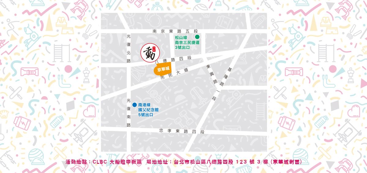 - 場地地址:台北市松山區八德路四段 123 號 3 樓(京華城對面)