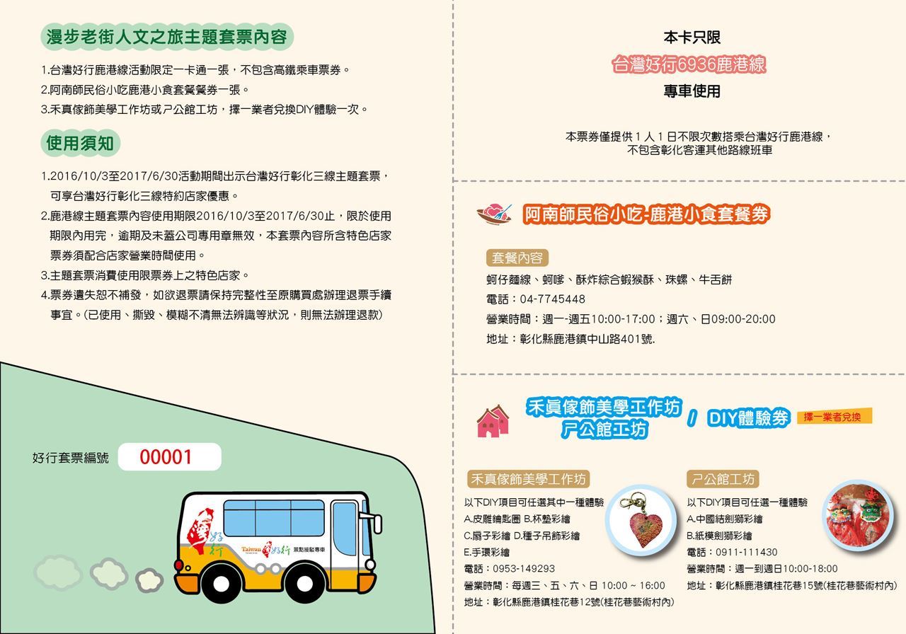 2. 鹿港線主題套票內容使用期限2016/10/3至2017/6/30止,限於使用期限內用完,逾期及未蓋公司專用章無效,本套票內容所含特色店家票券須配合店家營業時間使用。