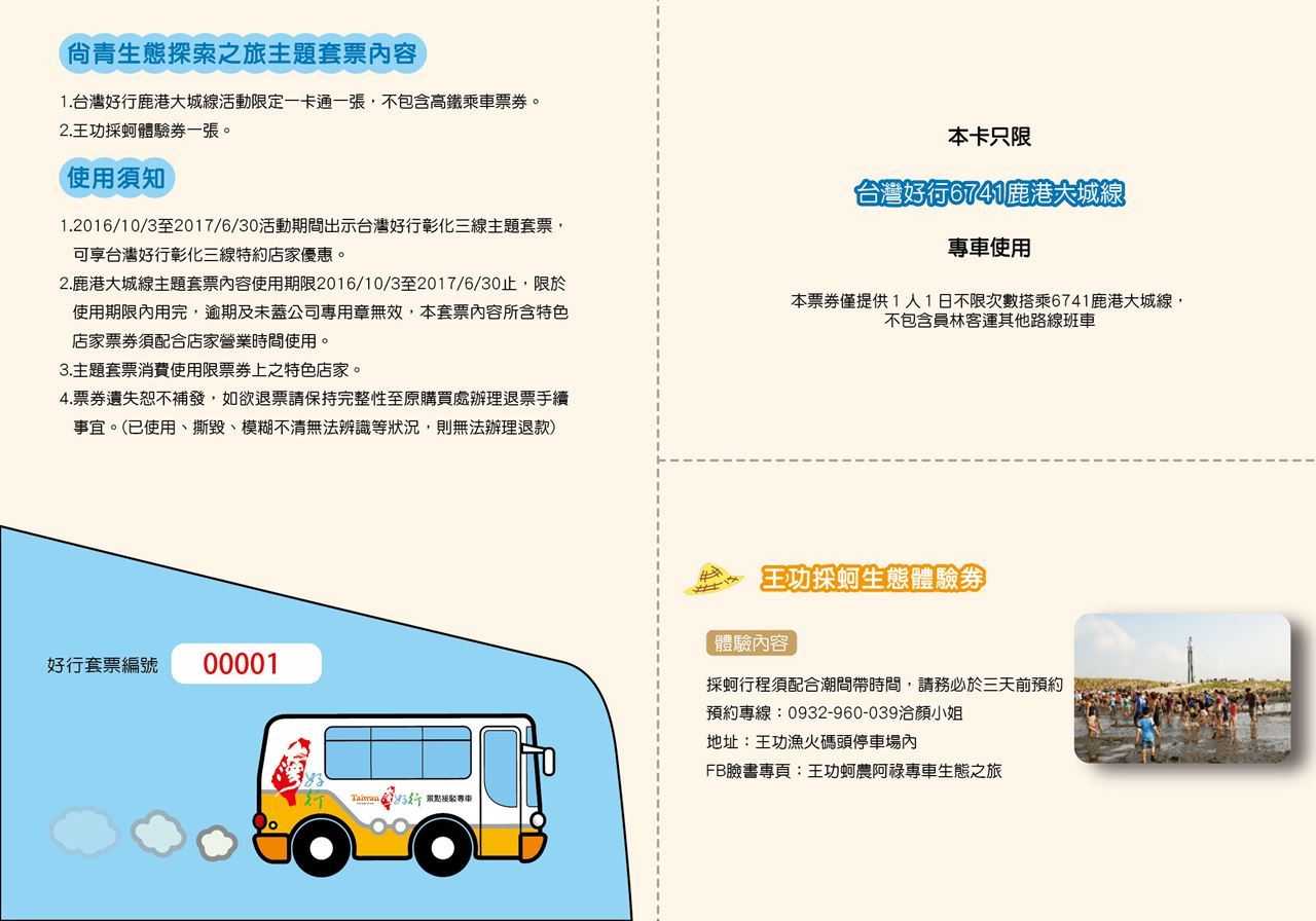 一卡通一日乘車兌換券 | 本卡只限台灣好行「6741鹿港大城線」專車使用, 本票券僅提供1人1日不限次數搭乘6741鹿港大城線,不包含員林客運其他路線班車 |