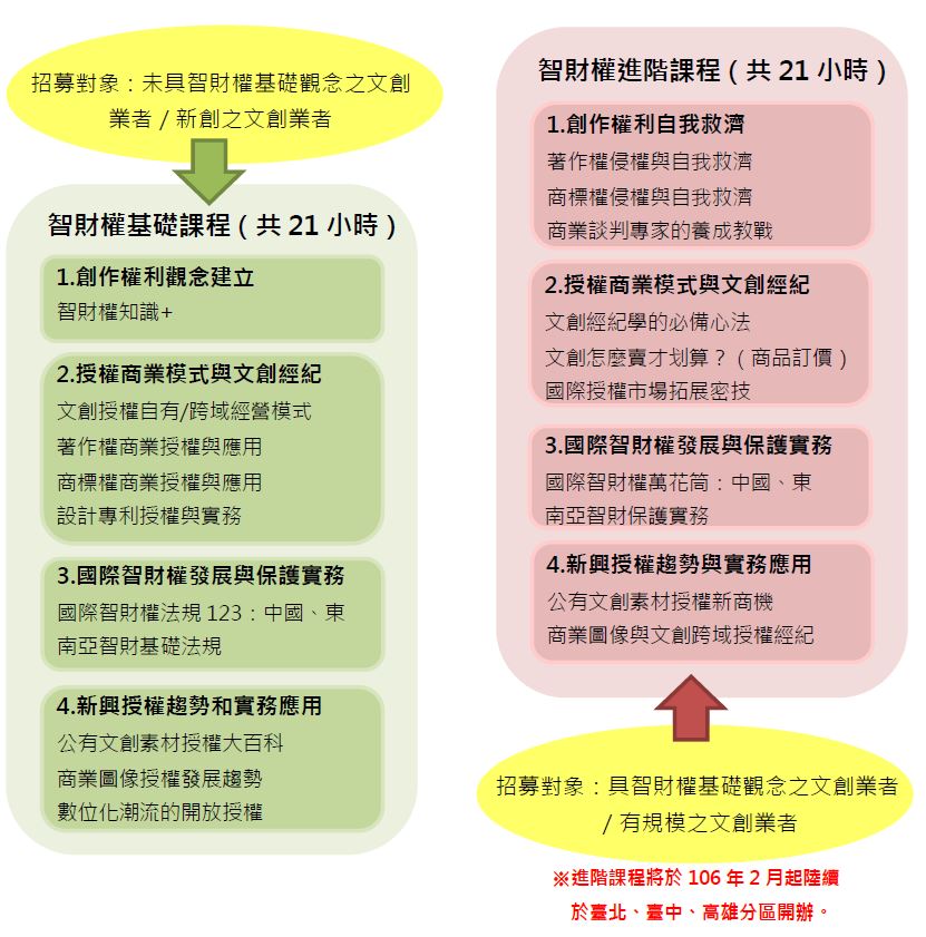 ※本年度為基礎課程,進階課程將於106年2月陸續在台北、台中、高雄分區開辦,共計四梯次。相關活動訊息將於106年1月公告至<文化部文創推動服務網>最新消息。