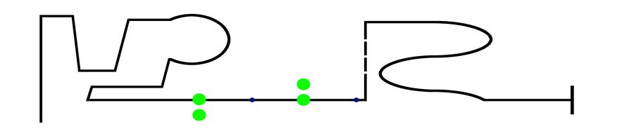 圖1為場地參考示意圖(詳細尺寸以比賽當天為準),場地為一般的木板或地板,貼上大圖印刷的表面,有一條約2.5公分寬的黑色軌跡線,軌跡線上會有斷線。行進路線上共放置4 個寶特瓶(圖上圓形綠色處);寶特瓶的容量約0.6 公升,圓柱形,不裝瓶蓋,瓶口着地倒立,外表可能有貼產品標籤)。軌跡線上的藍(紅)點距離寶特瓶約40 公分,木板的接合處可能有某種程度的不平坦。