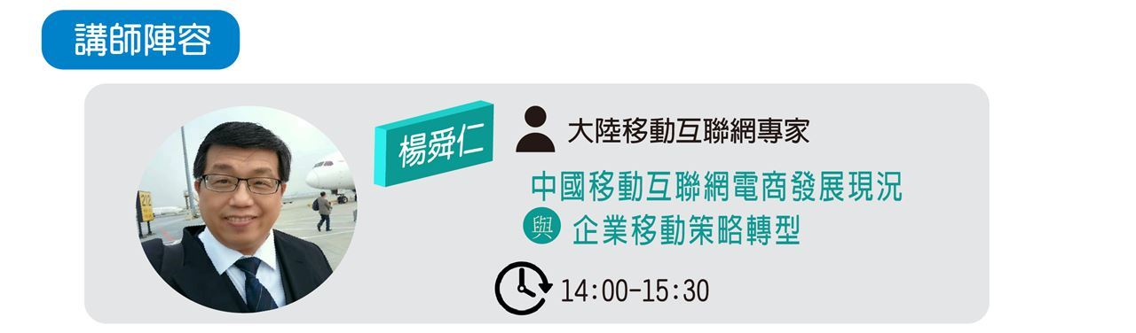 大陸移動互聯網專家,專研數據分析與電商營銷數十年,擁有豐富企業管理與顧問授課經驗,目前長期服務於中國大陸,對於行動互聯網之實例與最新發展應用有著最真實道地的見解,這次講座特別從中國回到台灣,為大家帶來最新的第一手市場趨勢與企業移動分析 !