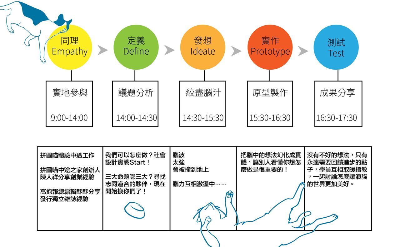 這次,社企流要結合設計思考(Design Thinking)工具,首度和關注動物議題的媒體《窩抱報》及希望自己自足的中途之家《貓便當菜》跨界合作,在動物保護法大翻修、即將實施收容所「零安樂死」政策前夕(註),邀請來自各方,卻都關注這個議題的夥伴們,一起探討台灣動物保護議題所面臨的困境,如何透過倡議提高大眾關注,並找到能永續經營的商業模式,甚至進入政策端從法規改善現有的政策缺失。