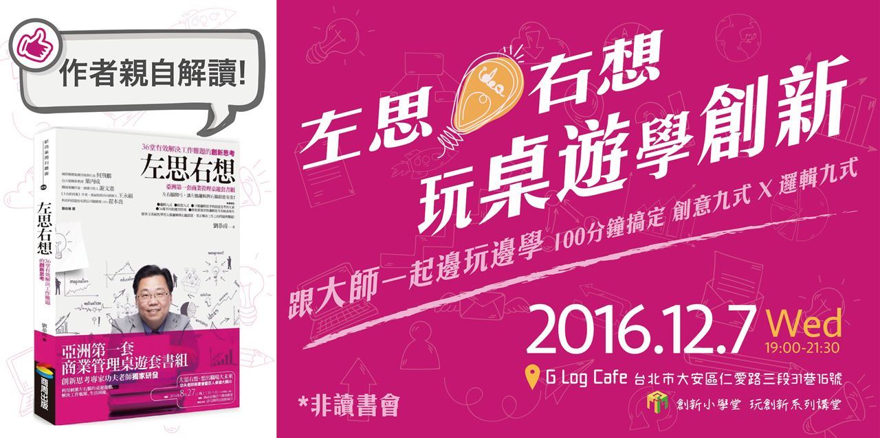 12月的創新小學堂,邀請到的是「不懂這些別懂加薪」、「左思右想:36堂有效解決工作難題的創新思考」等暢銷書的作者,同時也是兩岸企業內訓創新講師的劉恭甫老師。將以「左思右想:36堂有效解決工作難題的創新思考」這本書做為基礎,帶大家在短短100分鐘內,了解創意九式與邏輯九式如何幫助你在生活與工作中更創新!