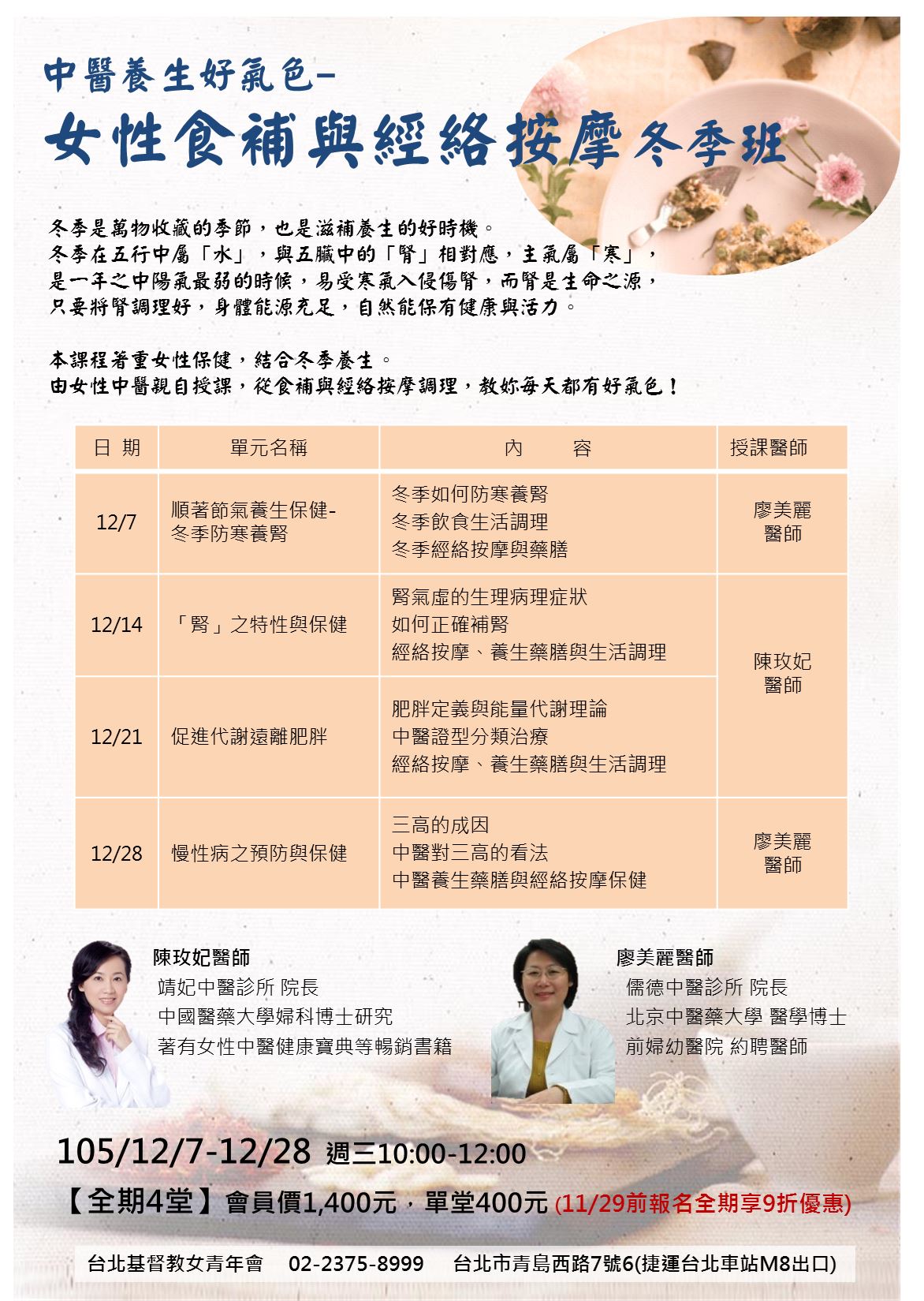 11/29前報名全期享9折優惠線上報名 :https://www.ywca-taipei.org.tw/course/Course.aspx?...台北基督教女青年會台北市中正區青島西路7號(捷運台北車站M8出口)報名專線:02-2375-8999