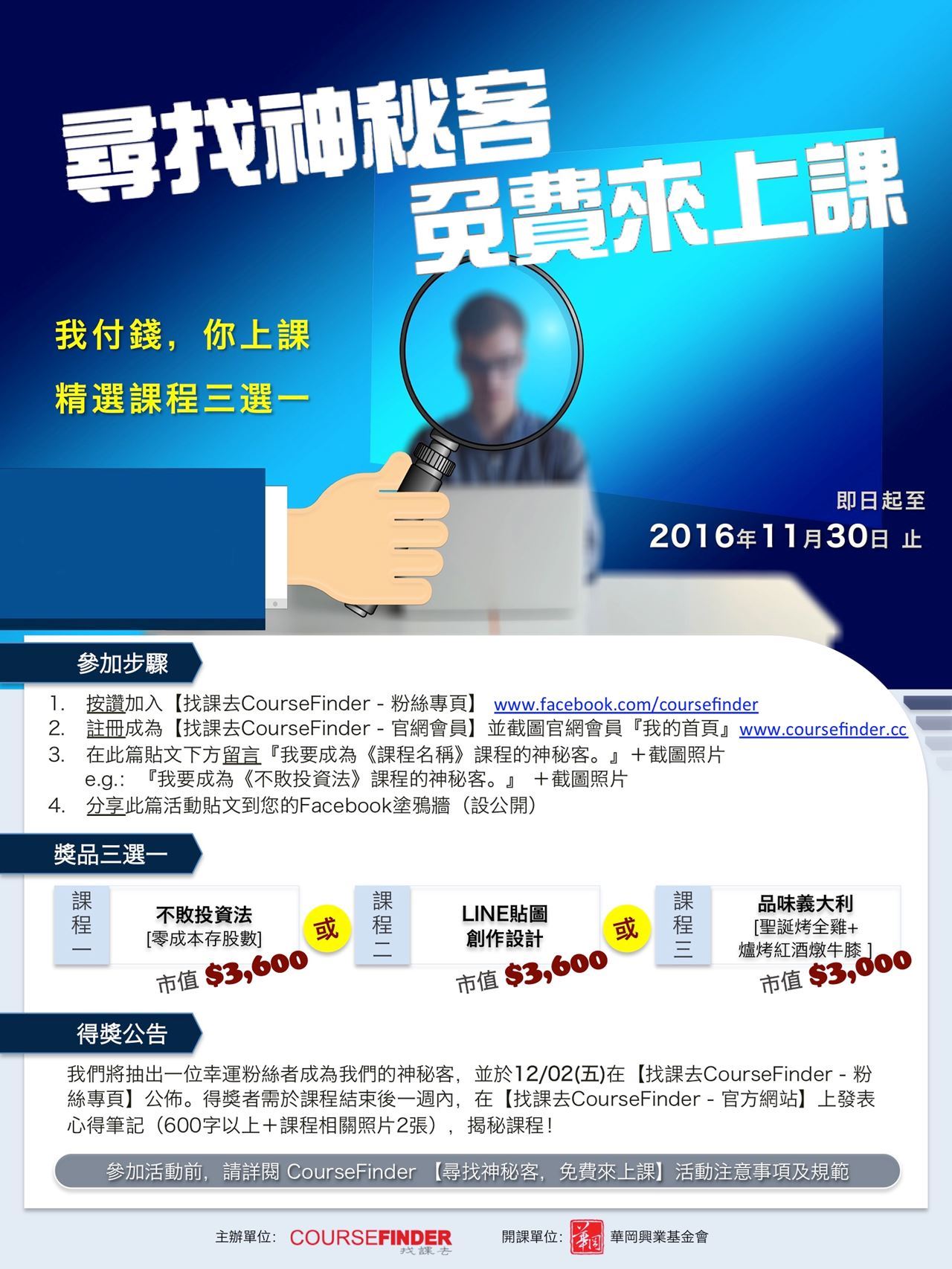 只要完成我們的參加步驟,說出你想參加哪一門精選課程,我們將抽出一位幸運粉絲者成為我們的神秘客!