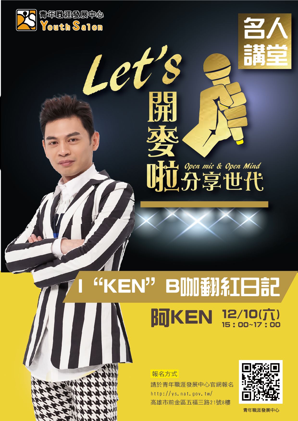 從幕後人員開始做起的阿KEN,當過攝影助理、道具等等,ㄧ開始月領25K的陪襯小咖,這小咖的生涯整整渡過了8年的時間,阿KEN認真面對每一次演出,面對機會都抓緊可能性,才慢慢的增加曝光機會,堅定持續的努力下才成今日就最紅B咖。