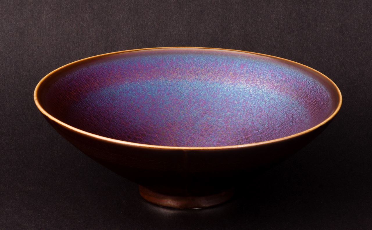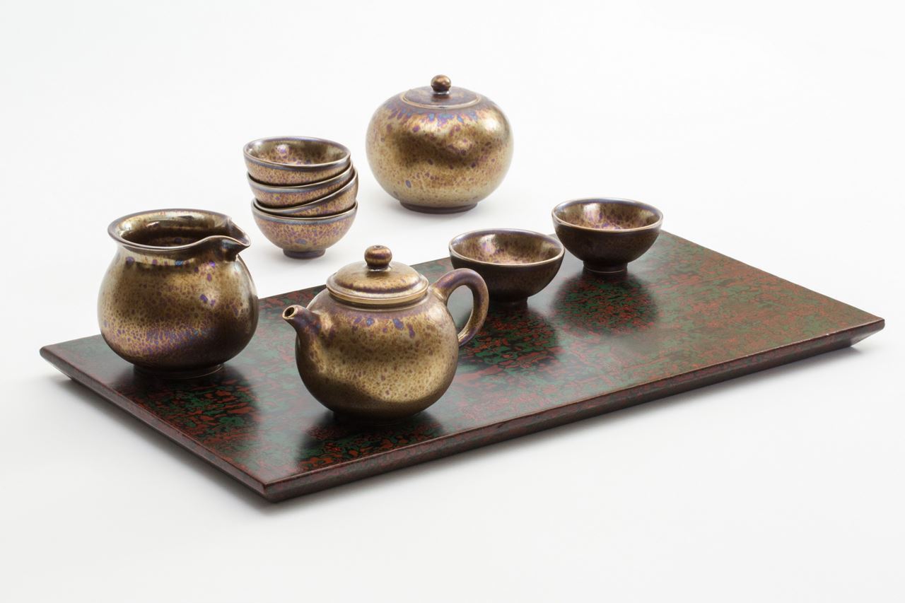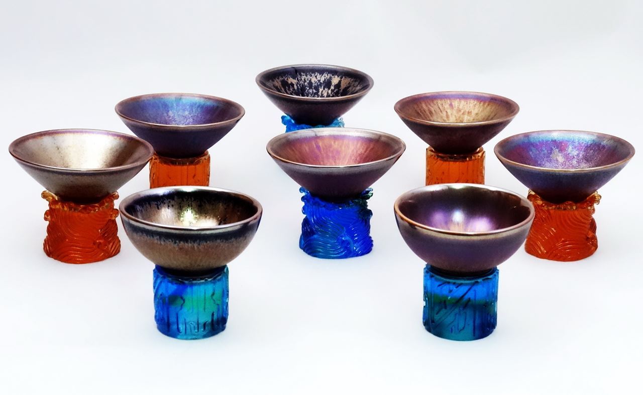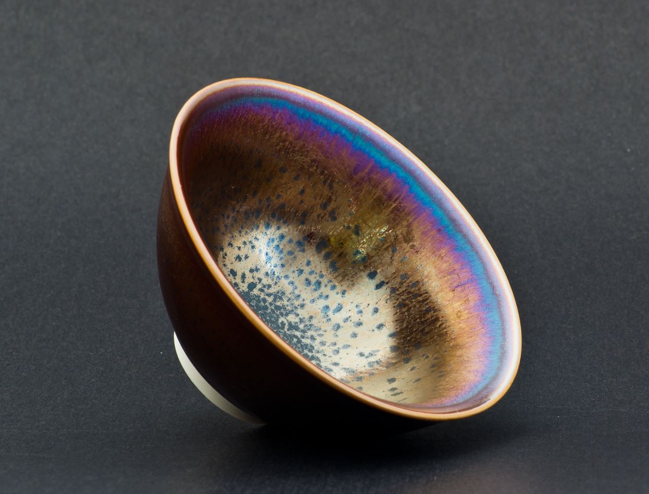 曜變天目釉, 以氧化鐵為發色劑結合稀土元素,經多次來回進窯高溫燒煉,每個溫度點產生不一樣顏色,期間有紅橙黃綠藍靛紫等七彩色。金色、紫色、紅色、藍色、銀色等是常燒出顏色,為天然負離子能量陶瓷。