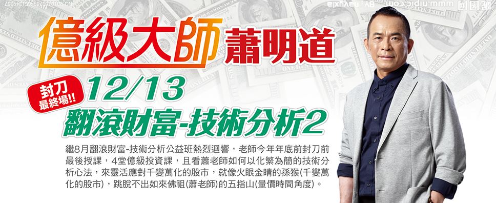認識蕭明道曾在股市負債一身,卻靠著『技術分析』,五年後在股市翻身大賺三億元。已擁有三十年投資經驗的他,陸續從股市所賺獲利回饋捐贈公益,更帶動學生從股市賺錢做公益,舉凡偏鄉兒童、弱勢家庭,捐助不遺餘力,愛心堪為典範,遽聞目前已捐出復康巴士達38台(一台近200萬)。課程介紹(一)轉折判斷,頭底(價量關係)(二)中繼突破、跌破(三)指標研判技巧(四)當沖操作技巧(期指五分)【費用】新生$9000、舊生$8100【地點】集思台大會議中心-蘇格拉底廳(台北市羅斯福路4段85號B1,近捷運公館站2號出口)※報課程即可加入蕭明道Line群組,加購$500購本課DVD(預計2017/1/月出版)。