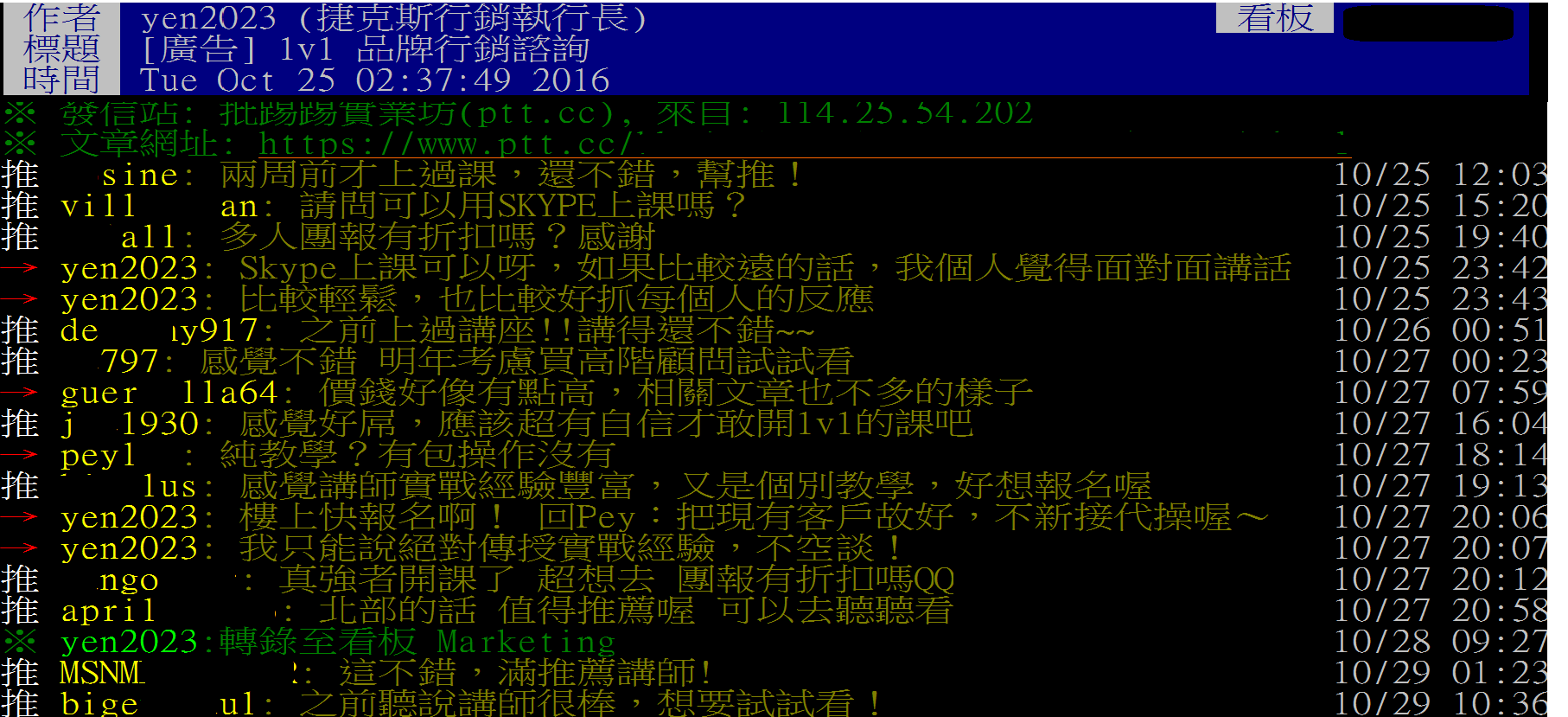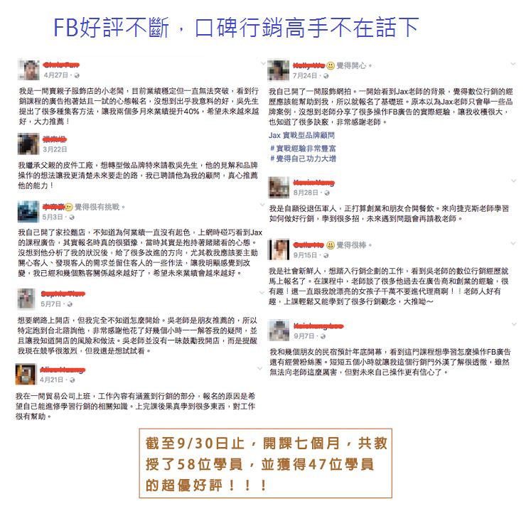 想學實戰行銷、新創企業想生存、轉型企業想經營品牌,Jax教練趕陪你們打鴻海戰場與創造事業藍海,絕非空洞行銷觀念無法實作,累積多年網路行銷與實體活動企劃品牌公關的經驗與實戰技巧,有興趣的朋友千萬別錯過,真實PTT與臉書學員推薦,等你成為下個實戰高手。