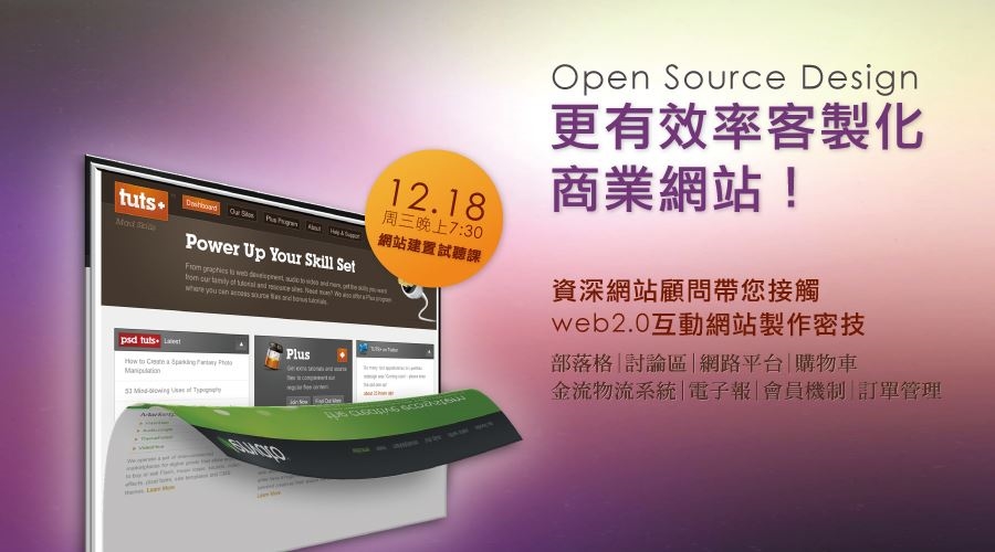 以上這些問題,將在本堂課由資深網站顧問帶您接觸web2.0互動網站製作密技,展示各類網站,是如何以免費開放式原始碼,做出符合業主要求的網站屬性!真正克服程式技術門檻,在後台設計,前台立即呈現!適合無網頁基礎者,更適合網頁設計工作者,歡迎您親自體驗最有效率的網站製作方法。