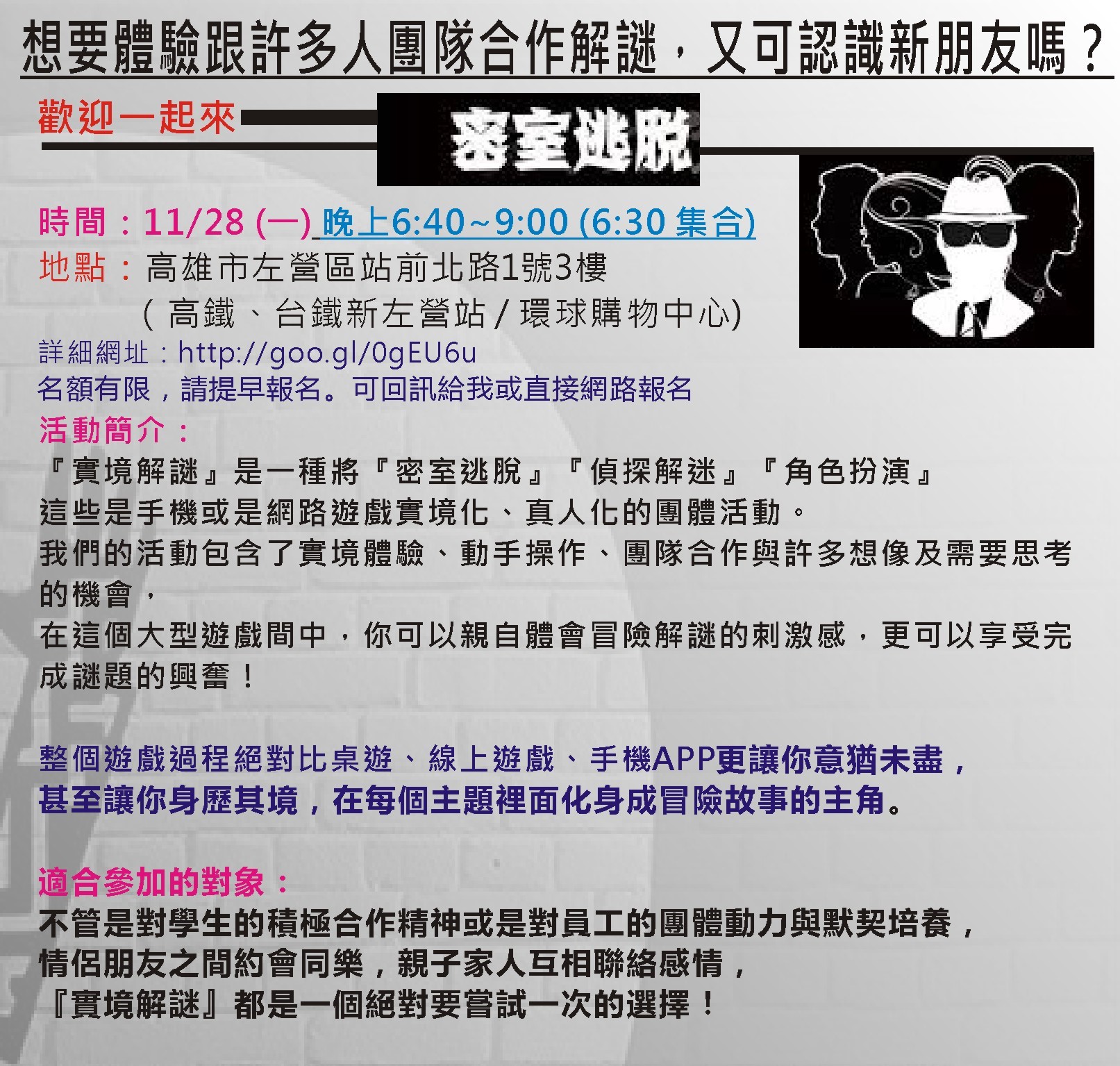 時間:11/28 (一) 晚上6:40~9:00 (6:30 集合)