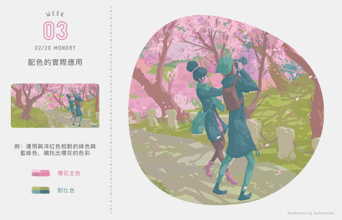 每堂課,都會設定一個練習主題,讓大家從插畫創作中直接練習配色。而除了介紹對色彩的基本認知外,還會帶領學員如何去認識和分析每一幅作品裡的用色。並介紹各種插畫風格和設計風格裡的配色模式以及典故,提供給學員更多色彩上的靈感。豐富好玩又實用的色彩計畫課,二月等你一起來學習喔!