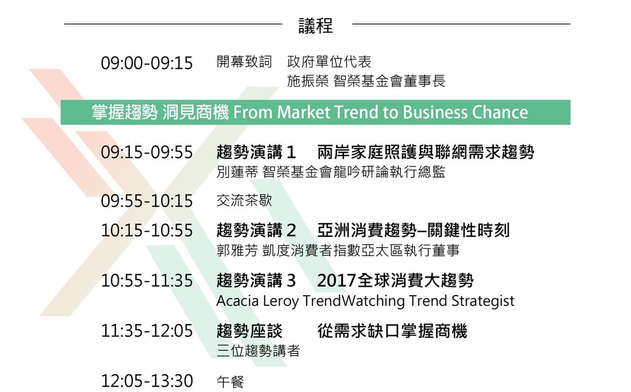 2017,我們從「家庭照護與聯網需求」切入,一方面擴大視角,抓出兩岸、亞洲到全球消費趨勢脈動,一方面深入探索「創新管理與實踐」,巨觀看布局、微觀練技巧,完整落實觀念與執行,為您的企業在不確定的年代,打造領先競爭力。