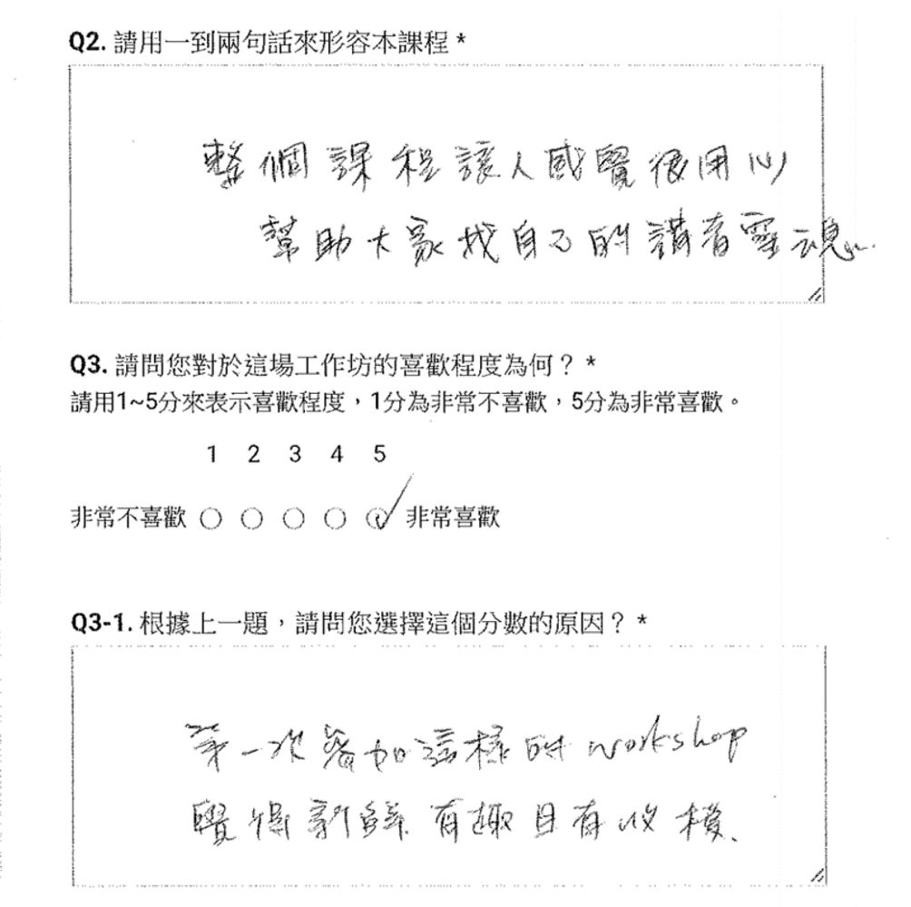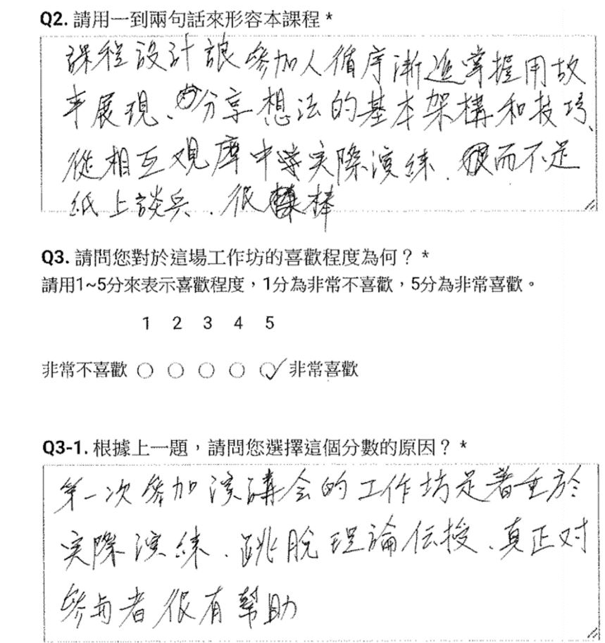 動畫師Debbie:「課程裡很多講故事的建議及訣竅一直被我記在心裏,習慣用滑鼠表達故事的我並不擅長運用表情及肢體甚至是聲音,看到老師在台上侃侃而談、表情豐富,在台下的我深知這是多年功力累積而成,就像是我的動畫專業一樣,沒有多年紥實的一次次實戰是不可能有今天的游刃有餘,一堂課,8個小時,只是個入門,讓我窺見另一個世界。我會好好累積各種技巧(聲音訓練、肢體動作、一句入魂還有觀眾互動等),更重要的是覺察自己的故事,才能在每次上台時感動台下的觀眾。」