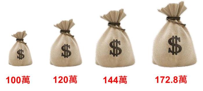 到了第三年會變成 144 X 1.2 = 172.8萬