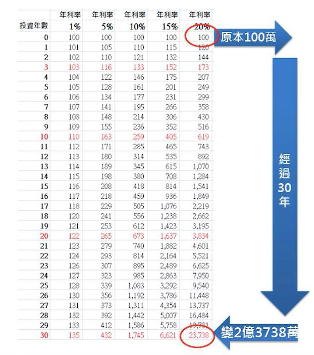 年利率1%的變成135萬 年利率20%的就已經變成 2億3738萬