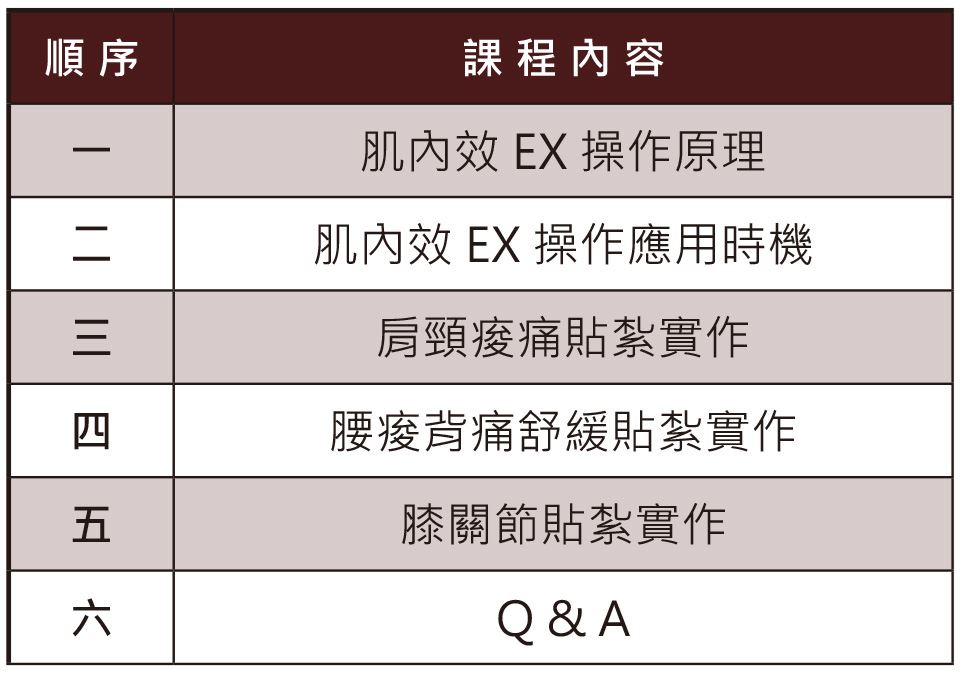 本課程特別為使用肌內效貼布的新手而設計,針對日常生活中常見的五十肩、腰酸背痛、膝蓋痠痛無力,透過簡單快速的貼紮手法,讓您體驗到肌內效EX的神奇魅力。肌內效EX團隊教您如何一次使用就上手!