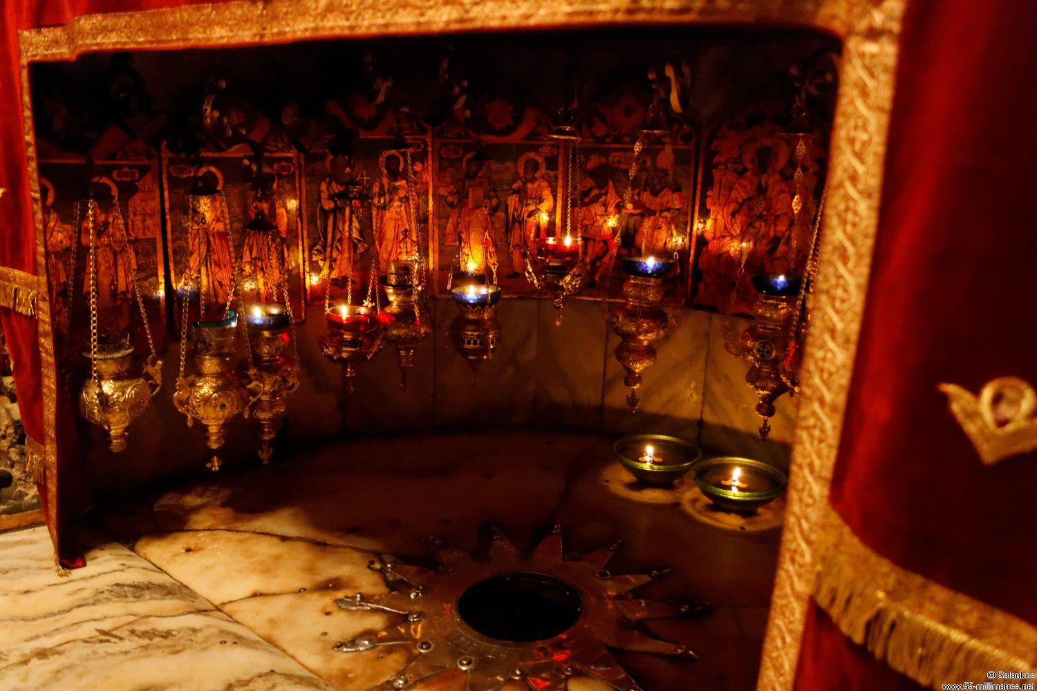 約一米的半圓紅白大理石中央鑲嵌著銀十四角星,上書拉丁文「這裡是聖母瑪利亞誕下耶穌基督之地」。
