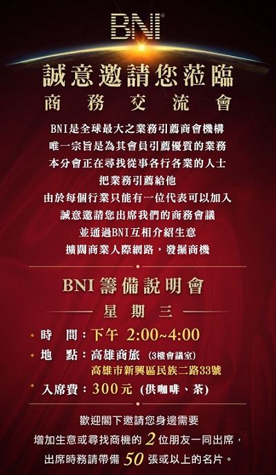 ↓連結到BNI高雄市中心區官網看更多訊息↓
