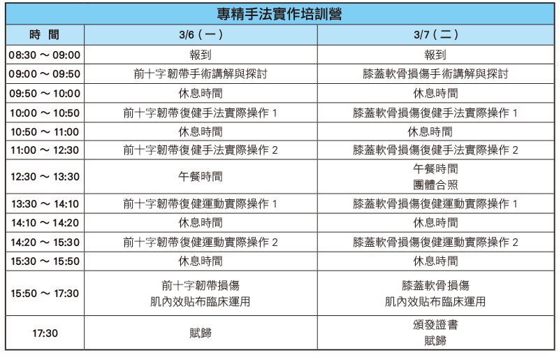 本次運動醫學臨床復健研習營將會從生理解剖與實際開刀過程講起,再帶到術後復健階段與運動員回場訓練;不同於以往只有單純的讓同學聽課,更重要的是增加了兩天的實作課程,讓美國講師實際的帶領學員操作手法,而在這整個過程當中,也會示範針對膝關節的特殊貼紮法,讓每位參與的學員能夠收穫滿滿,回到工作場上能實際的運用所學的知識幫助到更多患者。