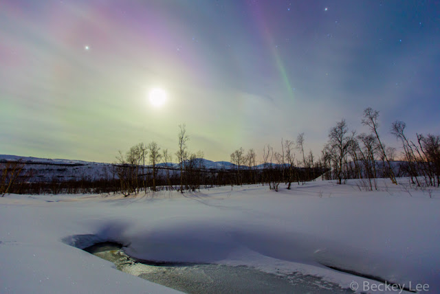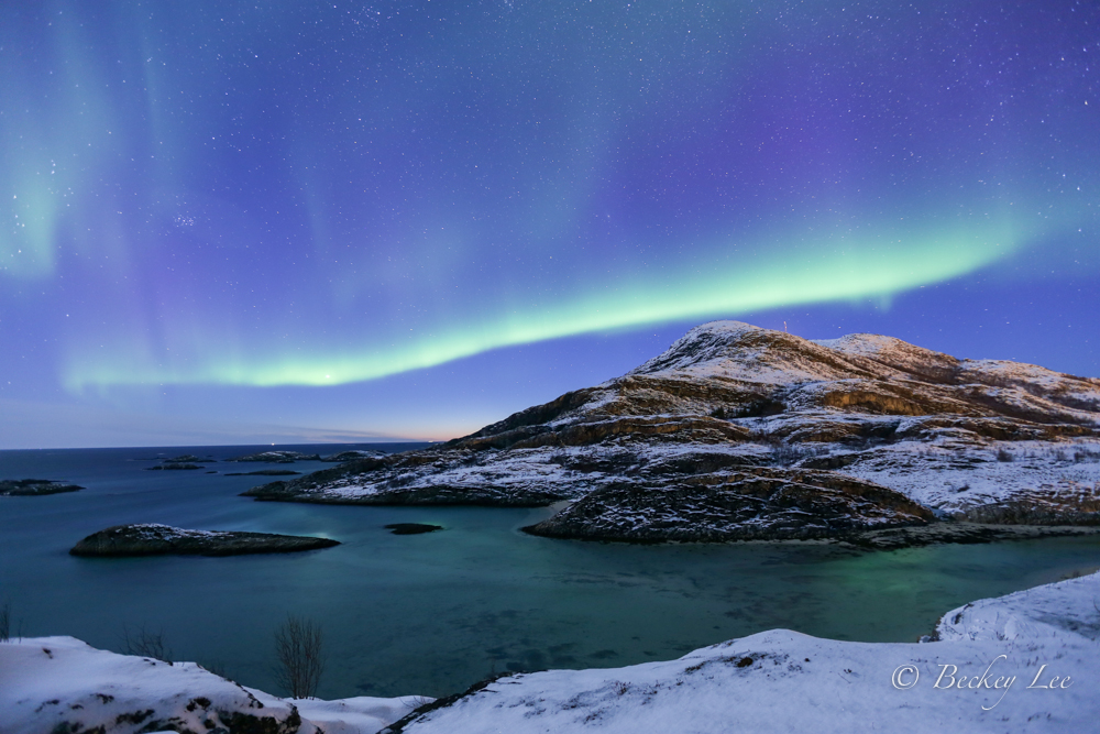當我在勉強可以看見雪地腳印的極低光源狀態下,踏上山頂看見月光灑落四面環抱覆雪峽灣的海面時,我便賴著不走,儘管坡頂上毫無遮蔽物,冷風颼颼,吹不熄內心的興奮。