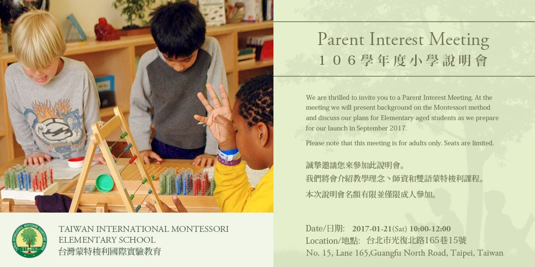欲知更多有關本校信息,歡迎加入本校Facebook專頁 www.facebook.com/montessoritaipei 或發送電子郵件至 Taiwanmontessori@gmail.com。