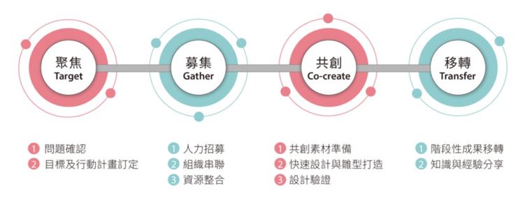 Action核心團隊已投入大量心血進行本次議題研究;透過本階段的「募集」將形成本次設計行動的主力,一同進入「共創」階段,在兩個月的期間與高雄具指標性的居服中心、輔具中心、日照中心、相關非營利組織、私部門合作,透過場域觀察、跨領域專家訪談、實作工作坊、設計執行與討論,產出嶄新的設計解決方案,並將後續成果與知識「移轉」,進一步發展出可落實的行動方案。(如上圖)