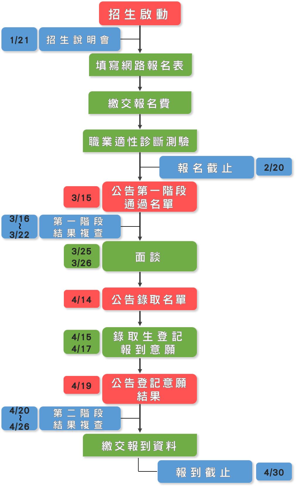 詳閱簡章內容→上網填寫報名資料→繳交報名費→完成職業適性診斷測驗