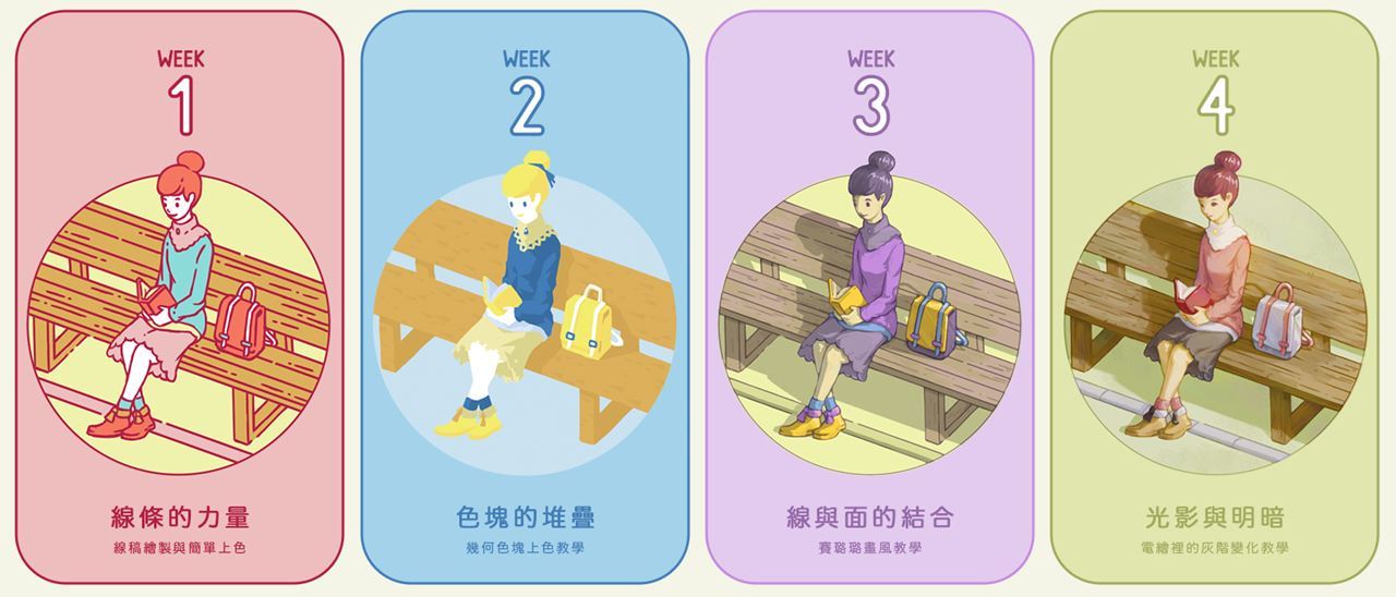 課程中,Authan老師會教授四種插畫呈現方式和實作練習:從線條到色塊、光影到質感;讓學員由淺入深、按部就班地熟練電腦繪圖的技法。課程也會分享各種上色方法必須注意的細節,以及一些Photoshop實用的功能,便於有效率的用電腦進行創作。