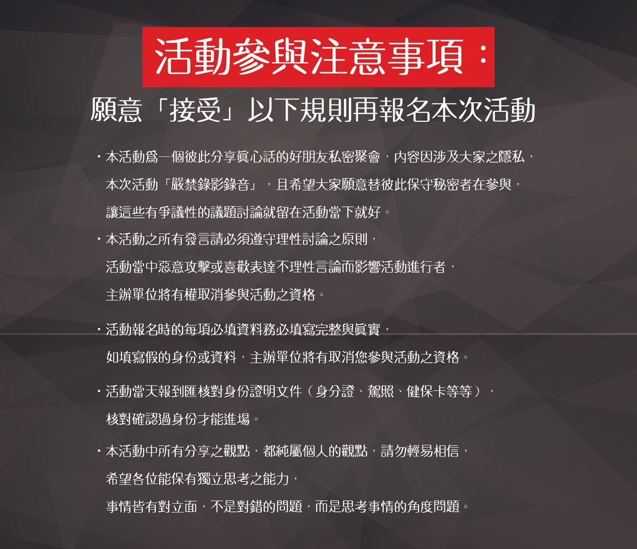 如果第一次有順利,我們就預計 3~4 個月可以辦一次這樣的秘密聚會,但也有可能人不夠多,或許也有可能只有這一次,每次分享的主題也都會不一樣,所以不要想著下一次,人生就是在許多的下次之中流逝掉。