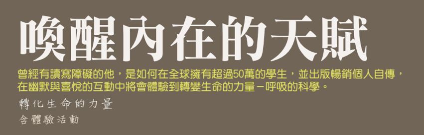 本次主題將透過啟發性的演講並帶領呼吸、靜心與個人成長,教導學員如何藉由呼吸喚醒內在的天賦(曾有逾五十萬學員因此受惠)。
