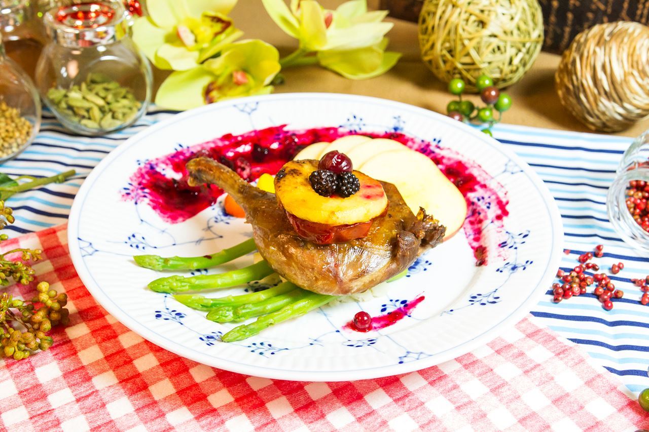 丹麥烤鴨腿佐越莓醬(不附蘆筍、水果)、白花椰佐烤鮭魚蒔蘿湯、