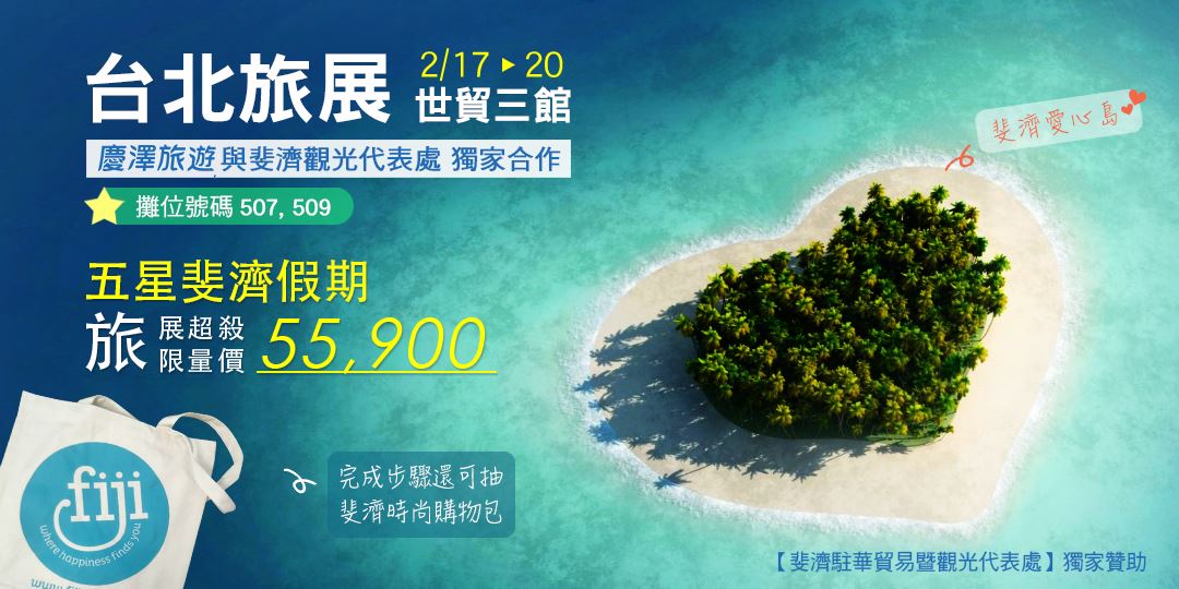 2. 留言:@標記2位好友+2/17~2/20台北旅展世貿三館 #慶澤旅行社駐點斐濟駐華貿易暨觀光代表處攤位!斐濟五星假期限時超優惠只要55,900元 ▶https://goo.gl/Cm2AWd