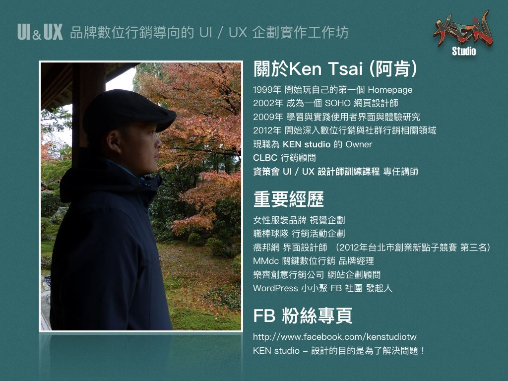 蔡肯是教學與業界實務經驗均豐富的講師,CLBC 已數度邀請阿肯前來開課。曾開辦 WordPress 架站課程,但在課程過程與學員的互動中發現,許多學員的需求遠不只是自己架設網站而已,於是進一步開辦了近年正夯的 UI / UX 領域入門課程。