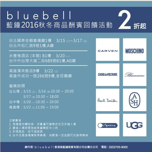 藍鐘2016 秋冬酬賓特惠活動來了!這次參與的品牌有:Blumarine, Moschino, Paul Smith, Carven, Zadig&Voltaire等男女時尚服飾、配件;廣受喜愛的LeSportsac各式包款、眾多好萊塢巨星喜愛的UGG時髦鞋履及個性潮鞋ASH,所有特賣商品2折起。